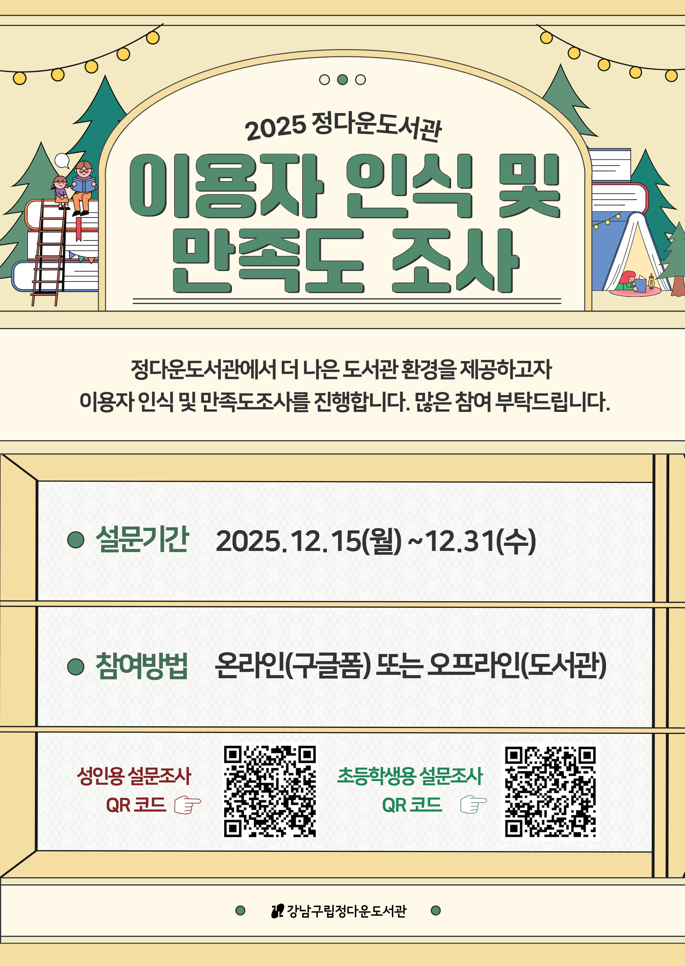 안녕하세요. 강남구립 정다운도서관입니다. 여러분과 함께 의견을 주고받으며 더 나은 정다운도서관을 만들어가고자 설문조사를 진행합니다. 잠시 시간을 내어 소중한 생각을 나눠주시길 바랍니다. ■ 설문응답기간 : 2025.12.15(월) ~ 12.31(수) ■ 설문참여방법 : 온라인 및 오프라인(정다운도서관) - 초등학생용 설문지 바로가기 - 청소년/성인용 설문지 바로가기