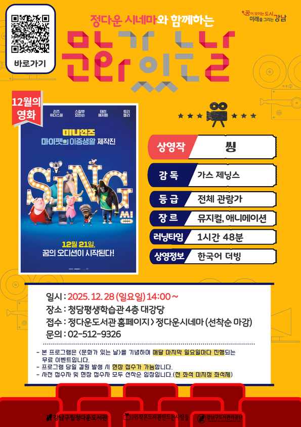 정다운시네마 12월의 영화 씽(Sing) * 도서관 사정에 따라 상영작은 변경될 수 있습니다. ⏰ 일시 : 2025. 12. 28. (일요일) 14:00~ (*상영작 러닝타임에 따라 시간 변동이 있을 수 있습니다.) 📮 장소 : 청담평생학습관 4층 대강당 😽 대상 : 누구나 💻 접수 : 정다운도서관 홈페이지>정다운시네마 🎤 문의 : 02-512-9326(정다운도서관) 한때 잘나갔던 문(Moon) 극장의 주인 코알라 ‘버스터 문’(매튜 맥커너히)은 극장을 되살리기 위해 대국민 오디션을 개최한다. 하지만 한 순간의 실수로 우승 상금이 1,000달러에서 10만 달러로 바뀌게 되고 이로 인해 전국 각지에서 동물들이 몰려와 오디션에 참가하게 된다. 25남매를 둔 슈퍼맘 돼지 ‘로지타’(리즈 위더스푼), 남자친구와 록스타의 꿈을 키우는 고슴도치 ‘애쉬’(스칼렛 요한슨), 범죄자 아버지를 둔 고릴라 ‘조니’(태런 에저튼), 무대가 두렵기만 한 코끼리 소녀 ‘미나’(토리 켈리), 그리고 오직 상금이 목적인 생쥐 ‘마이크’(세스 맥팔레인)까지! 꿈을 펼치기 위해 한 자리에 모인 이들은 자신들의 무대를 시작하는데… 🎬 신청 바로가기