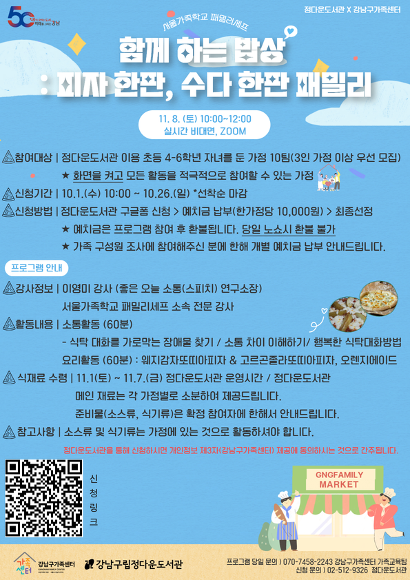 1. 4~6학년 어린이 + 부모 및 양육자 대상 프로그램입니다. (3인 이상 가정 우선 선정되나, 2인 가정일 경우 자녀의 조부모 및 다른 양육자와 함께 참여 가능합니다.) 2. 구글폼 신청 후 예치금 계좌를 문자로 안내드릴 예정입니다. 예치금(1만원)을 납부하셔야 최종 선정됩니다. 3. 프로그램 식재료는 정다운도서관에서 수령하여 진행합니다. 4. 구글폼 신청만 가능합니다. ★신청하러 가기★