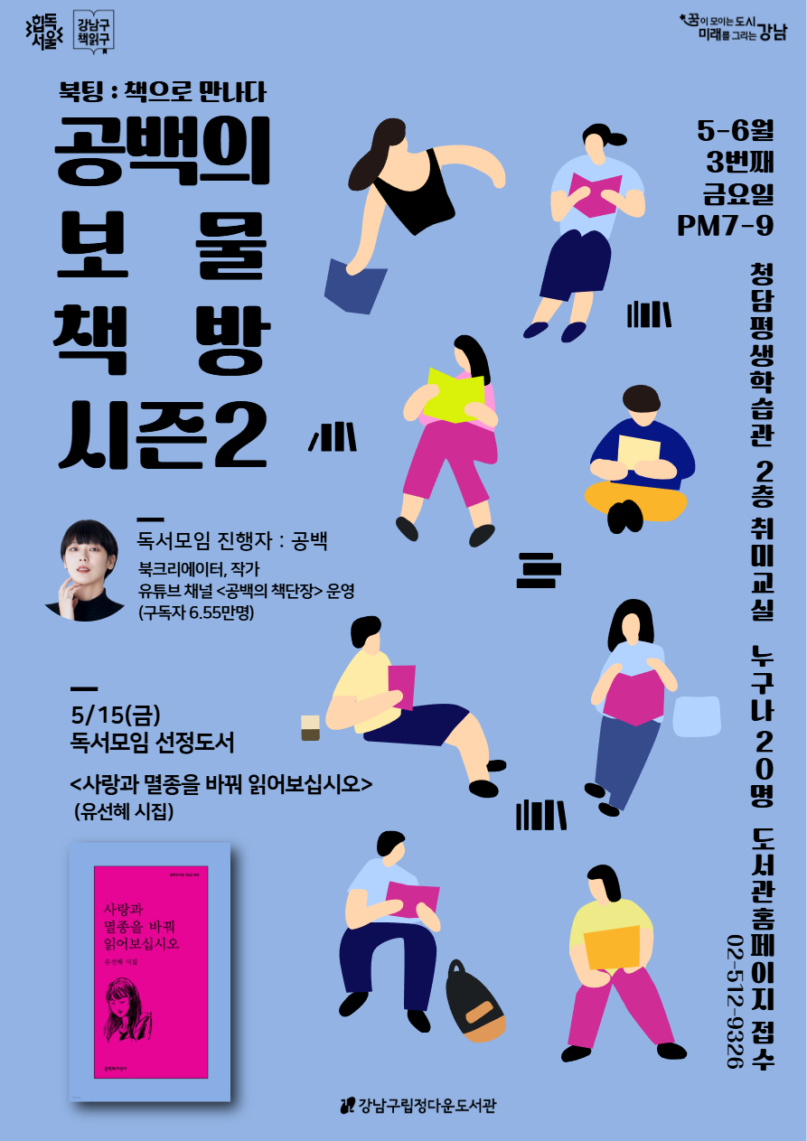 북튜버 공백과 함께하는 독서모임 시즌2! 한 달에 한 권, 보물같은 책을 읽고 함께 모여 이야기 나눠요! ■ 프로그램명 : "북팅:책으로만나다" <공백의 보물책방> 시즌2 ■ 5월 선정도서 : <사랑과 멸종을 바꿔 읽어보십시오> (유선혜 시집) ■ 5월 모임일시 : 2026. 5. 15 (금) 오후 7시~9시 ■ 진행 : 공백 (북크리에이터) ■ 장소 : 청담평생학습관 2층 취미교실 ■ 대상 : 성인 누구나, 20명 ■ 신청 : 정다운도서관 홈페이지 문화행사 게시판 ■ 문의 : 정다운도서관 (02-512-9326)