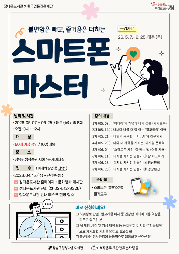 | 행사명 | 정다운 [대면][기관연계] 불편함은 빼고, 즐거움은 더하는 <스마트폰 마스터> |