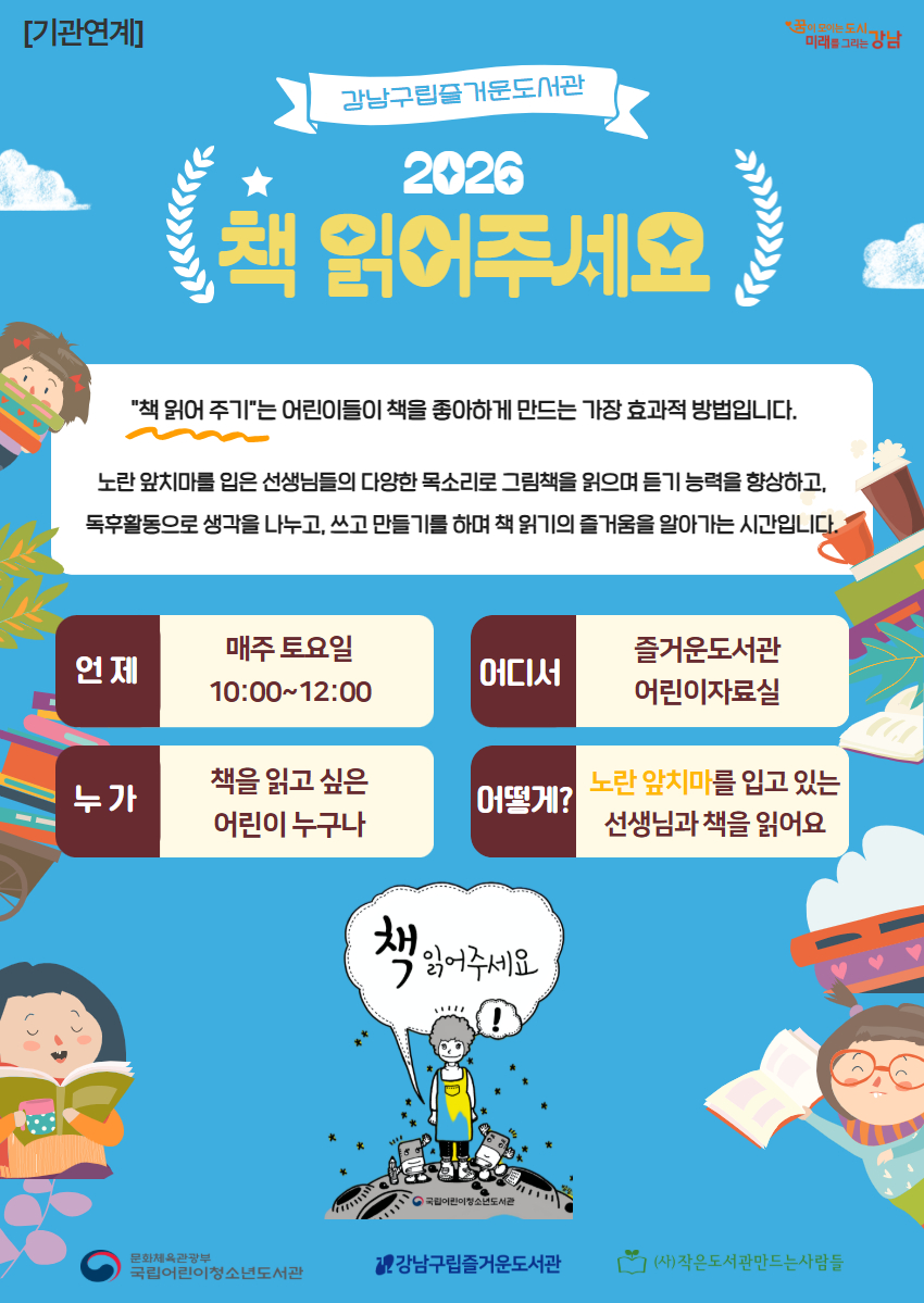 📚강남구립즐거운도서관 2026년 1월 '책 읽어주세요' 프로그램 모집📚 - 1월 매주 토요일 10:00~12:00 즐거운도서관 어린이자료실에서 노란 앞치마를 입은 선생님이 책을 읽어 드립니다. - "책 읽어 주기” 활동은 어린이들이 책을 좋아하게 만드는 가장 효과적 방법입니다 : ) 매주 토요일 즐거운도서관에서 함께 📖책 읽기 습관📖을 만들어보세요! - 문화행사에 신청하시면 행사 안내 문자를 발송해 드립니다. 당일 현장에서도 참여가능합니다 : ) ★ 2026년에도 즐거운도서관 '책 읽어주세요' 프로그램의 많은 관심과 참여 바랍니다 : )