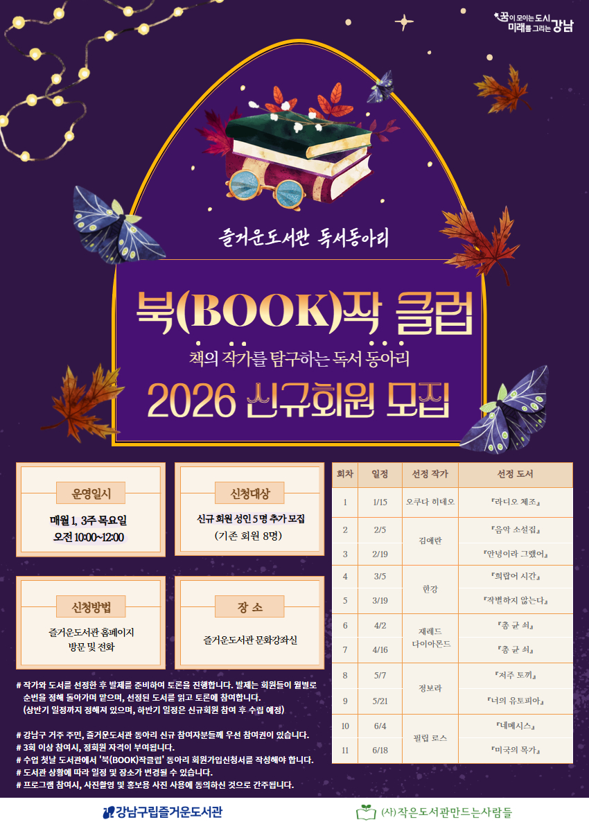 ● 즐거운도서관 2026년 성인독서동아리 '북(BOOK)작클럽' 신규회원 모집 - 기존 회원 8명 + 2026년 신규 회원 5명 - 작가를 중심으로 도서를 탐구하는 독서동아리입니다. - 작가와 도서를 선정한 후 발제를 준비하여 토론을 진행합니다. - 발제는 회원들이 월별로 순번을 정해 돌아가며 맡으며, 선정된 도서를 읽고 토론에 참여합니다. - 강남구 거주 주민, 즐거운도서관 동아리 신규 참여자분들께 우선 참여권이 있습니다. - 3회 이상 참여시, 정회원 자격이 부여됩니다. - 1년동안 동아리 활동 참여가 가능하신 분들께서만 신청 부탁드립니다.