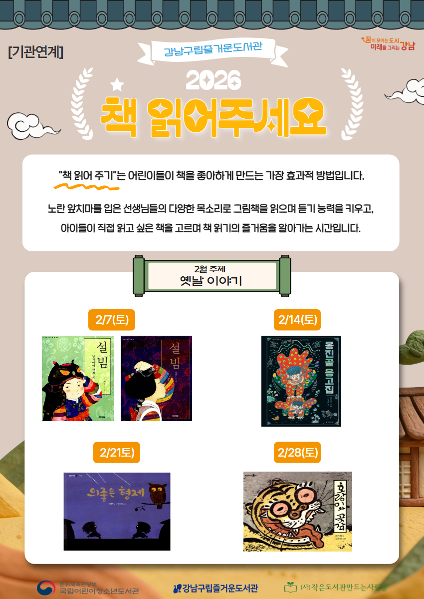 📚강남구립즐거운도서관 2026년 1월 '책 읽어주세요' 프로그램 모집📚 - 2월 매주 토요일 10:00~12:00 즐거운도서관 어린이자료실에서 노란 앞치마를 입은 선생님이 책을 읽어 드립니다. - "책 읽어 주기” 활동은 어린이들이 책을 좋아하게 만드는 가장 효과적 방법입니다 : ) 매주 토요일 즐거운도서관에서 함께 📖책 읽기 습관📖을 만들어보세요! - 문화행사에 신청하시면 행사 안내 문자를 발송해 드립니다. 당일 현장에서도 참여가능합니다 : ) ![]()