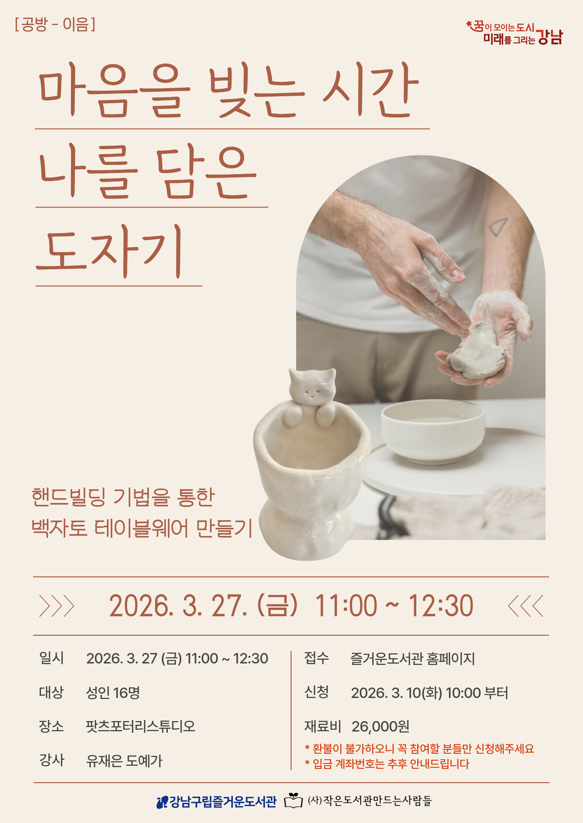 행사 당일 꼭 참여가 가능하신 분들만 신청을 부탁드립니다 (부득이하게 불참하실 경우 가족 또는 지인의 대리 참석이 가능합니다) 도자 핸드빌딩 기법으로 백자토를 사용해 나만의 테이블웨어를 만들어봅니다 손으로 천천히 형태를 만들며 집중과 이완의 시간을 가져보세요 📌재료비 납부 후 신청이 완료됩니다 - 입금 계좌는 추후 문자로 안내드립니다 - 환불이 불가하오니 신중한 입금 부탁드립니다 📌제작 약 4주 후 공방에서 완성품을 직접 수령하셔야 합니다 - 소성 완료 후 개별 수령 안내 예정 - 택배 수령 가능 (비용 별도) 📌프로그램 참여시 촬영된 사진은 도서관 홍보에 이용될 수 있습니다 ![]() |