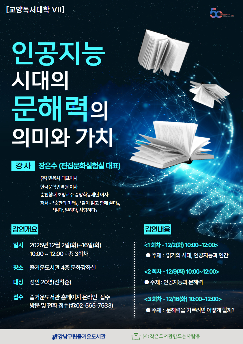 | 행사명 | 즐거운 [대면][교양독서대학VII] 인공지능 시대에 문해력의 의미와 가치 |
