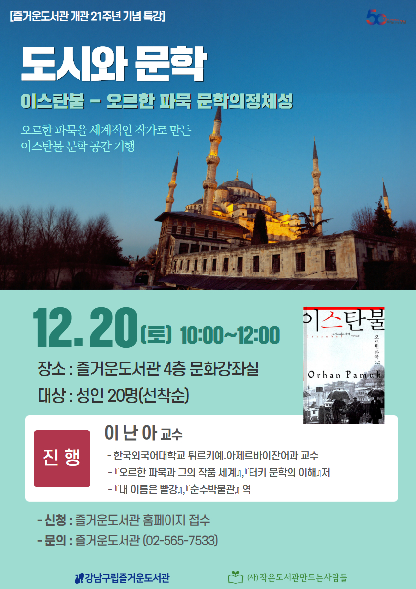 | 행사명 | 즐거운 [대면][개관21주년기념] 도시와 문학 : 이스탄불-오르한 파묵 문학의 정체성 |
