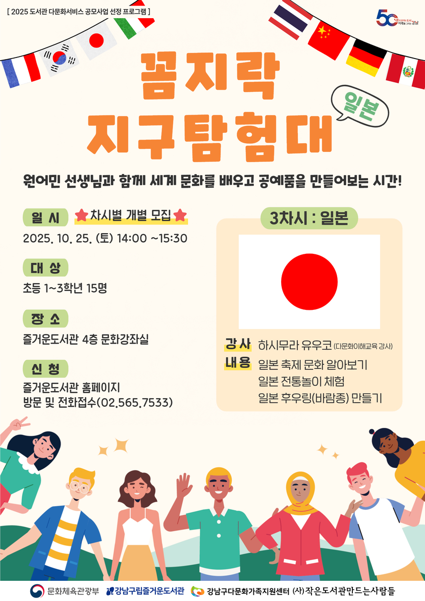 | 행사명 | 즐거운 [2025 다문화서비스 공모사업][기관연계-강남구다문화가족지원센터] 꼼지락 지구탐험대 '3차시-일본' |