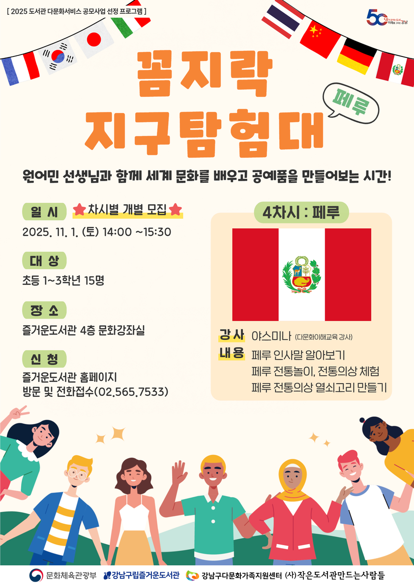 | 행사명 | 즐거운 [2025 다문화서비스 공모사업][기관연계-강남구다문화가족지원센터] 꼼지락 지구탐험대 '4차시-페루' |