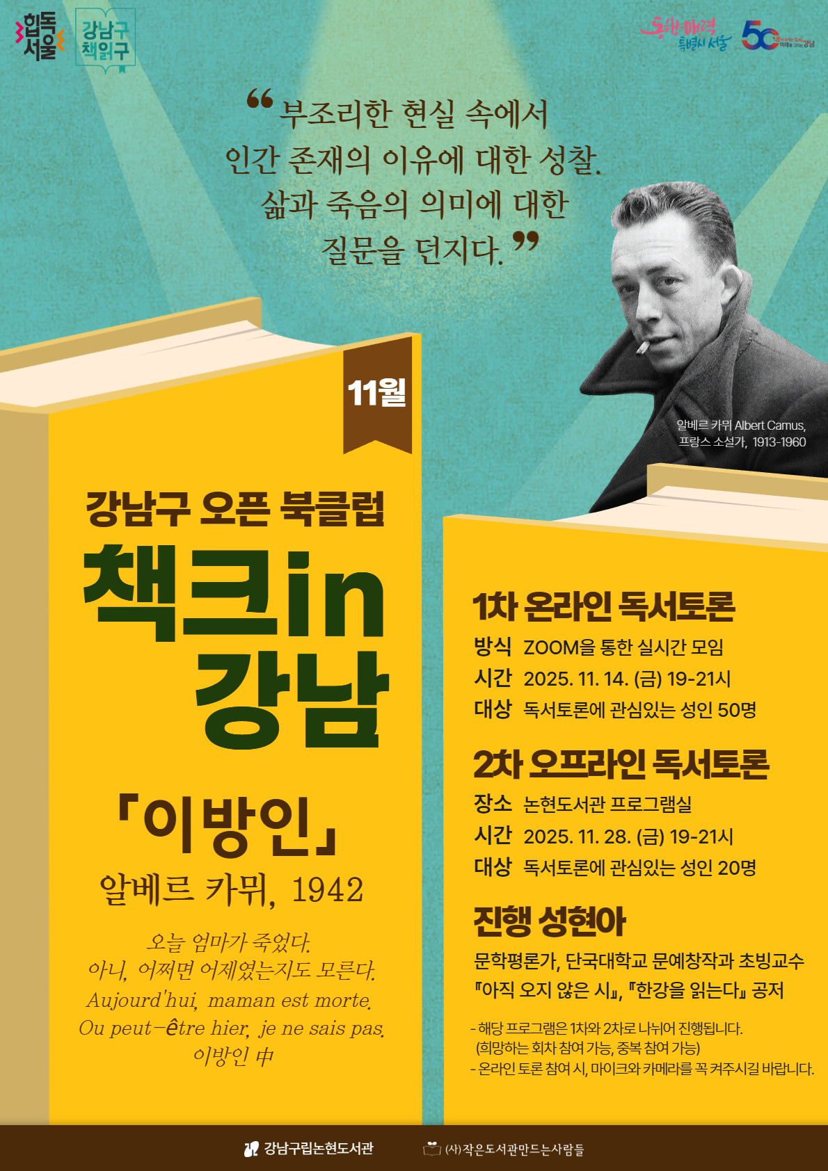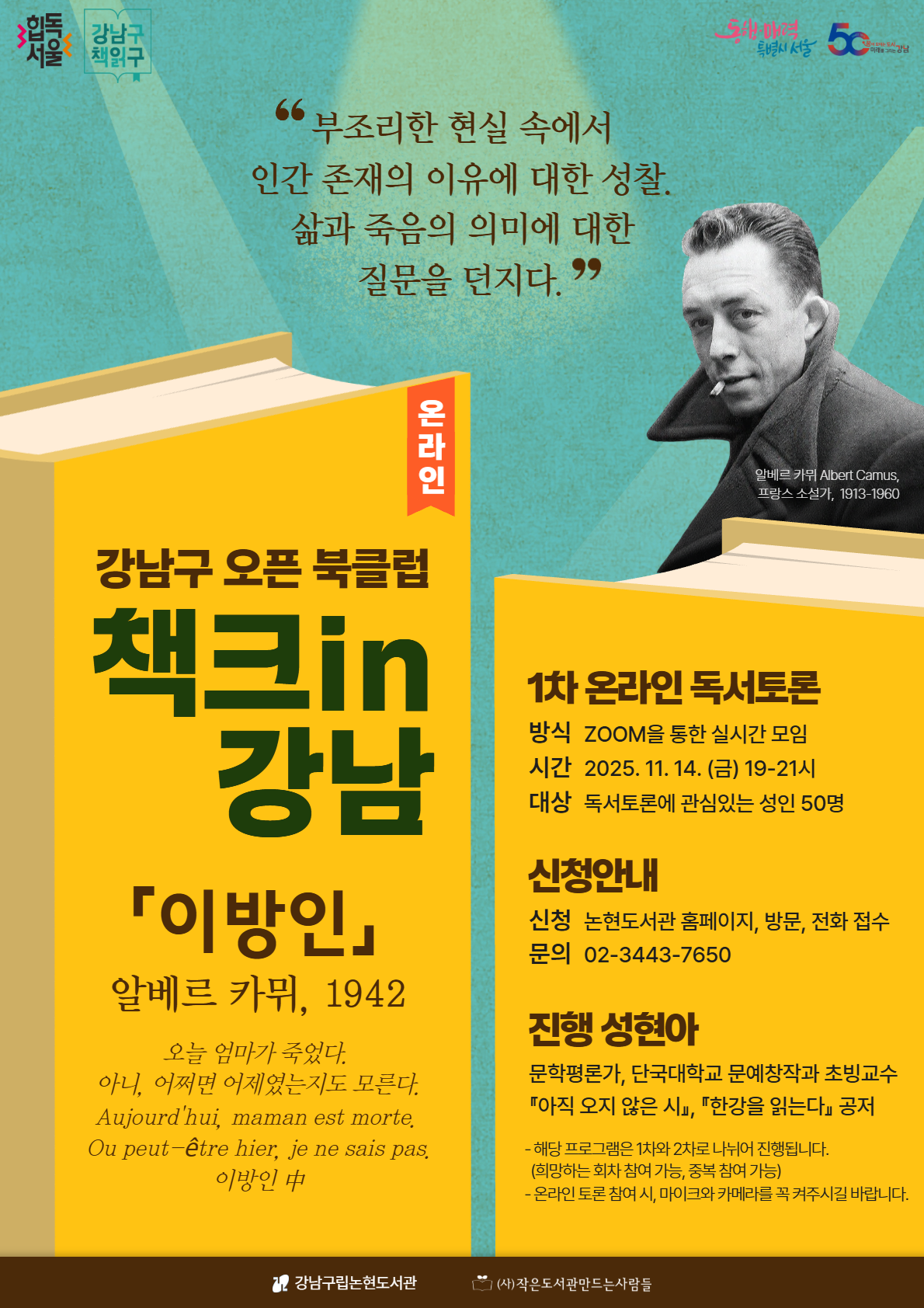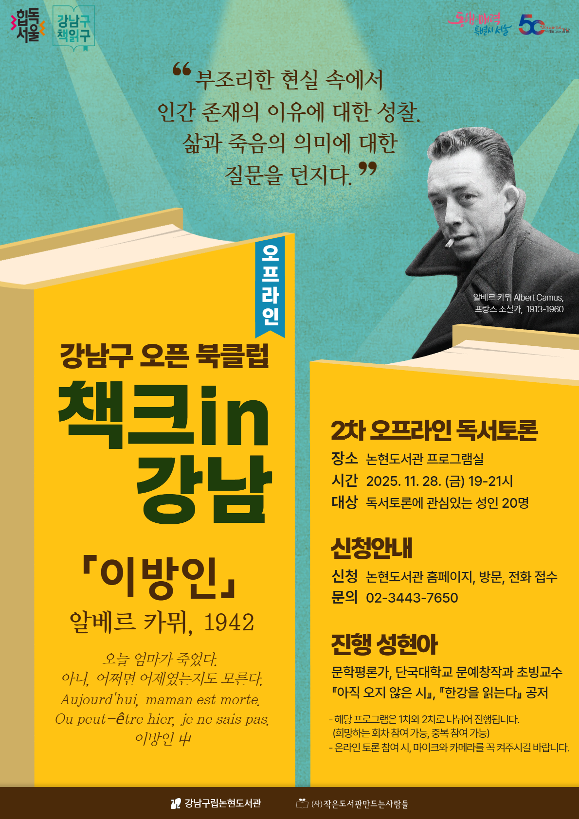 힙독서울 강남구책읽구 📚11월 강남구 오픈북클럽 책크in강남 온오프라인 독서토론에 초대합니다! 📖선정도서 : 『이방인』 알베르 카뮈, 1942 📢1차 온라인 비대면 독서토론 개요 1. 일시 : 2025. 11. 14. (금) 19:00~21:00 2. 방식 : ZOOM 실시간 화상 토론 3. 진행 : 성현아(문학평론가, 단국대학교 문예창작과 초빙교수) 4. 대상 : 독서토론에 관심 있는 이용자 50명(1회차와 2회차 중복 참여 가능) 5. 신청: 논현도서관 홈페이지, 전화, 현장접수 🖱️(클릭) 신청 바로가기 📢2차 오프라인 대면 독서토론 개요 1. 일시 : 2025. 11. 28. (금) 19:00~21:00 2. 장소 : 논현도서관 프로그램실 3. 진행 : 성현아(문학평론가, 단국대학교 문예창작과 초빙교수) 4. 대상 : 독서토론에 관심 있는 이용자 20명(1회차와 2회차 중복 참여 가능) 5. 신청: 논현도서관 홈페이지, 전화, 현장접수 🖱️(클릭) 신청 바로가기 ※ 본 프로그램은 1차-온라인, 2차-오프라인으로 나뉘어 진행됩니다. (중복 신청 가능하며, 희망하는 회차에 개별 참여도 가능합니다.) ※ 행사 신청 시, 홍보용 사진 촬영 및 활용에 동의한 것으로 간주됩니다. ※ 온라인 토론 참여 시에는 마이크와 카메라를 꼭 켜주시기 바랍니다. ※ 문의 : 논현도서관(02-3443-7650) ![]() ![]()
