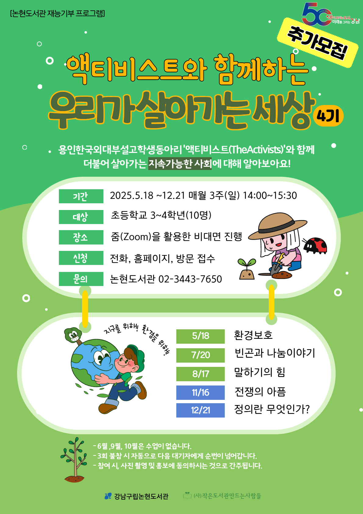 행사명 | 논현 [재능기부 프로그램] 2025년 액티비스트와 함께하는 우리가 살아가는 세상 4기(추가모집) |