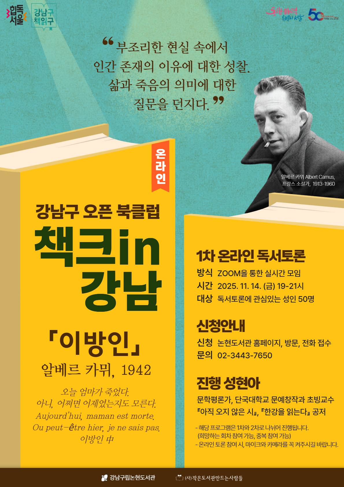 힙독서울 강남구책읽구 📚11월 강남구 오픈 북클럽 책크in강남 : 1차 온라인 토론 📖선정도서 : 『이방인』 알베르 카뮈, 1942 1. 일시 : 2025. 11. 14. (금) 19:00~21:00 2. 방식 : ZOOM(줌)을 통한 실시간 모임 3. 진행 : 성현아(문학평론가, 단국대학교 문예창작과 초빙교수) 4. 대상 : 독서토론에 관심 있는 성인 50명 ※ 본 프로그램은 1차-온라인, 2차-오프라인으로 나뉘어 진행됩니다. (중복 신청 가능하며, 희망하는 회차에 개별 참여도 가능합니다.) ※ 행사 신청 시, 홍보용 사진 촬영 및 활용에 동의한 것으로 간주됩니다. ※ 온라인 토론 참여 시에는 마이크와 카메라를 꼭 켜주시기 바랍니다. ※ 문의 : 논현도서관(02-3443-7650) ![]() ![]() |