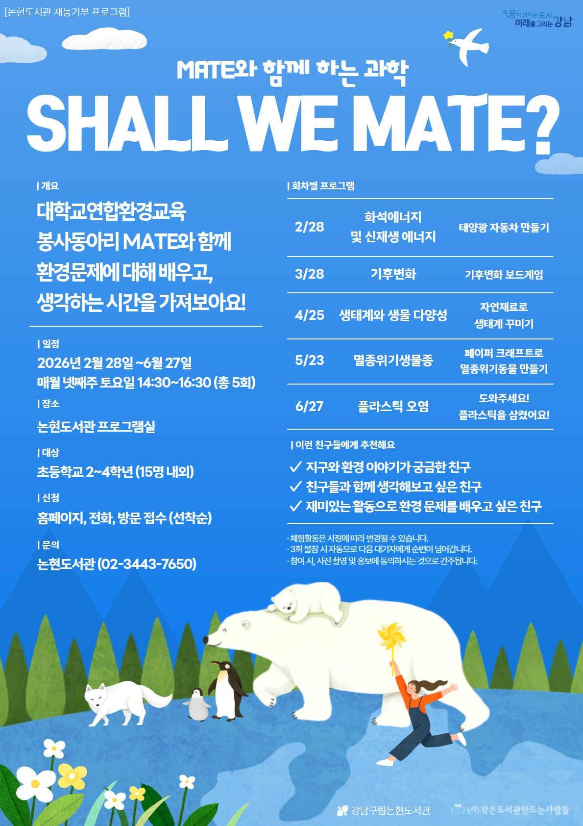 | 행사명 | 논현 [재능기부 프로그램] 2026년 메이트(MATE)와 함께하는 과학, Shall We Mate? (상반기 모집) |