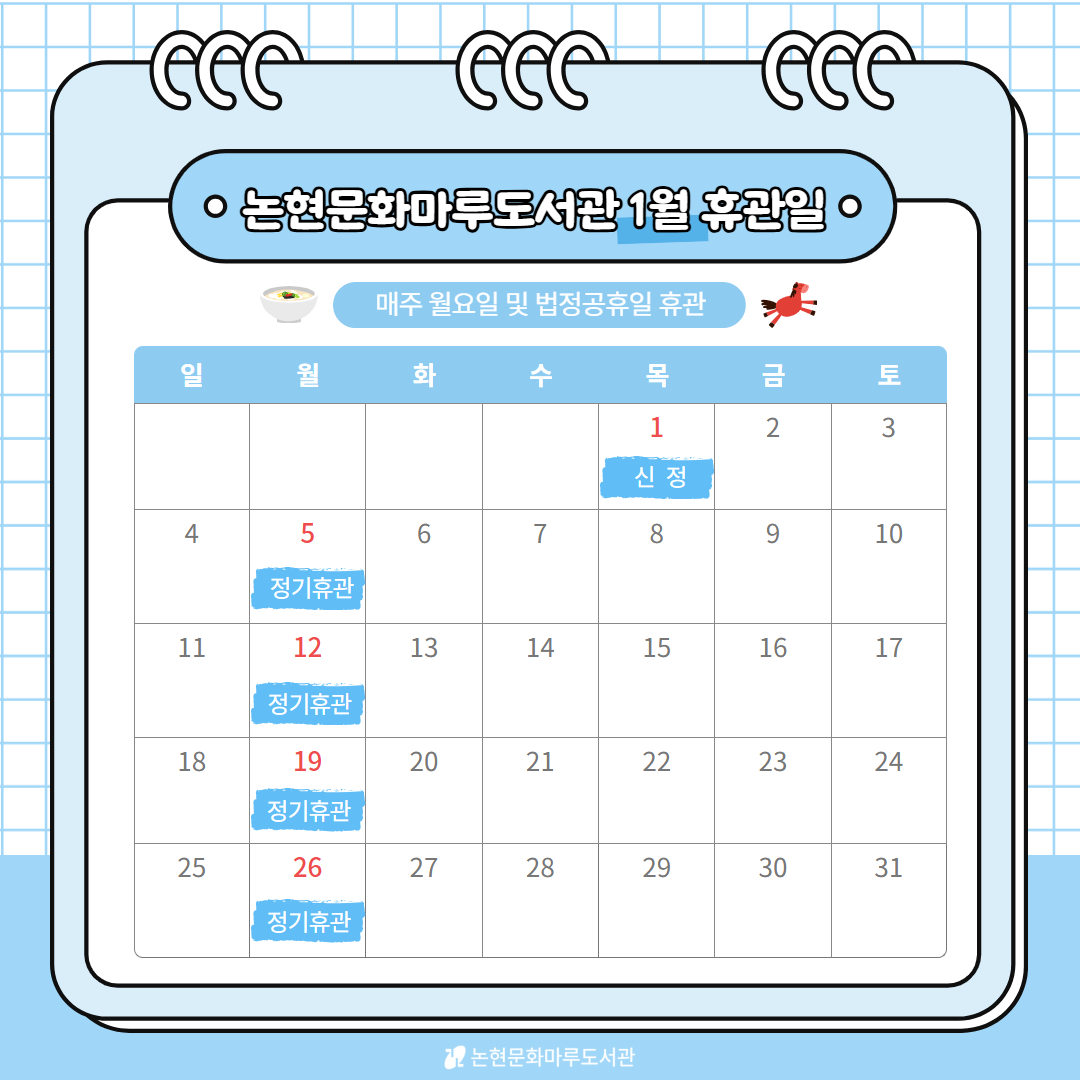 ※ 휴관일 도서 반납 시 '무인반납함', '무인대출반납기' 이용 부탁드립니다. (휴관일 다음날 소급 반납 처리)
