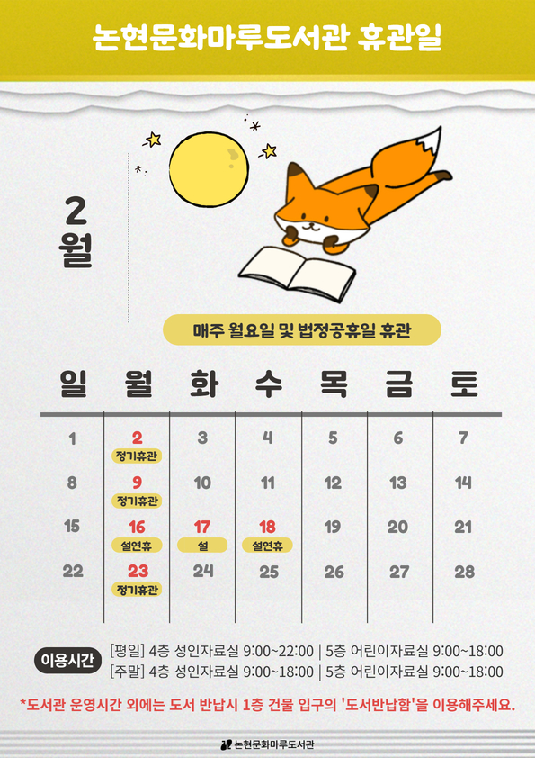 ※ 휴관일 도서 반납 시 '무인반납함', '자동무인반납기' 이용 부탁드립니다. (휴관일 다음날 소급 반납 처리)