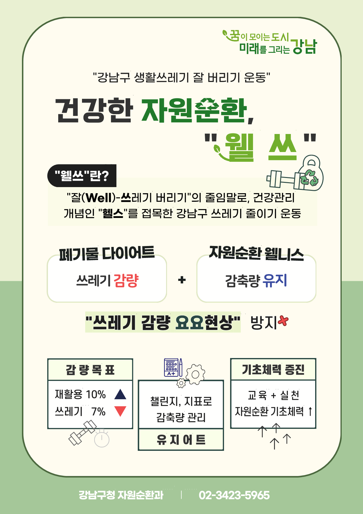 | 제목 | [강남구 생활쓰레기 잘 버리기 운동] 건강한 자원순환, '웰쓰'캠페인 안내 |