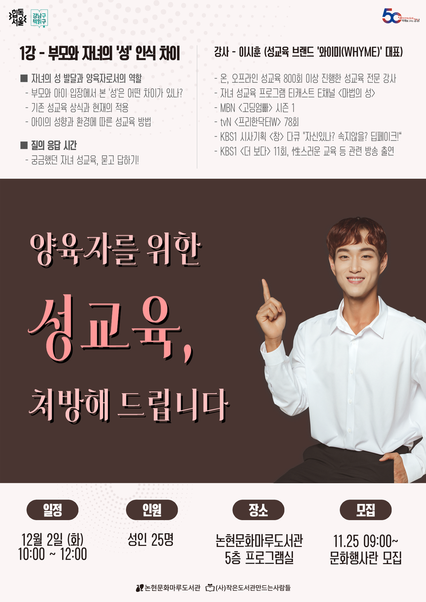 아이 양육의 계획이 있는 예비 양육자, 최신 성교육에 관심이 있는 성인 분들의 참여를 기다립니다. 해당 신청 페이지는 12월 2일(화)에 진행되는 1강 신청란입니다!!! 강의 당일, 이론 강의를 진행한 후 성교육 관련으로 궁금했던 점에 대해 강사님께 자유롭게 묻고 답하는 질의응답 시간이 진행될 예정입니다. ![]() ![]() |