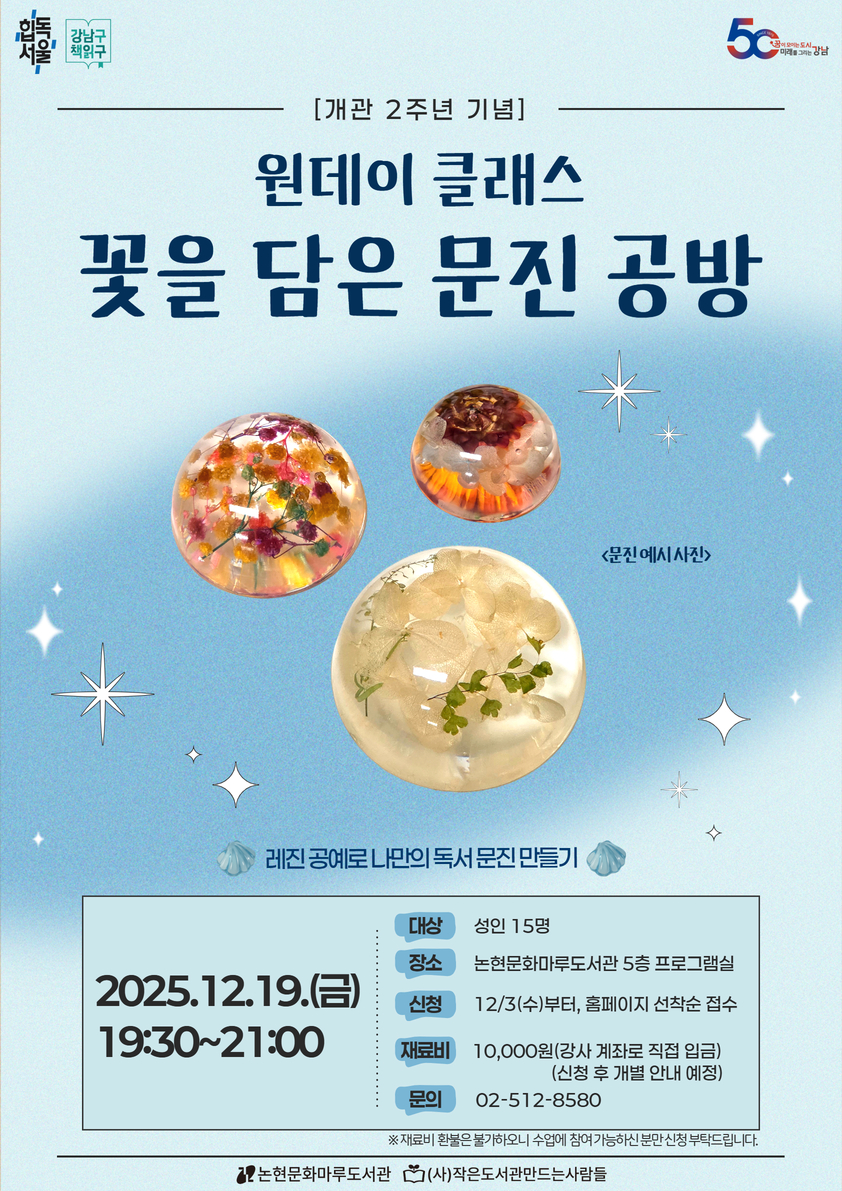 | 행사명 | 논현문화마루 [성인] [개관 2주년 기념] (원데이 클래스) 꽃을 담은 문진 공방 |