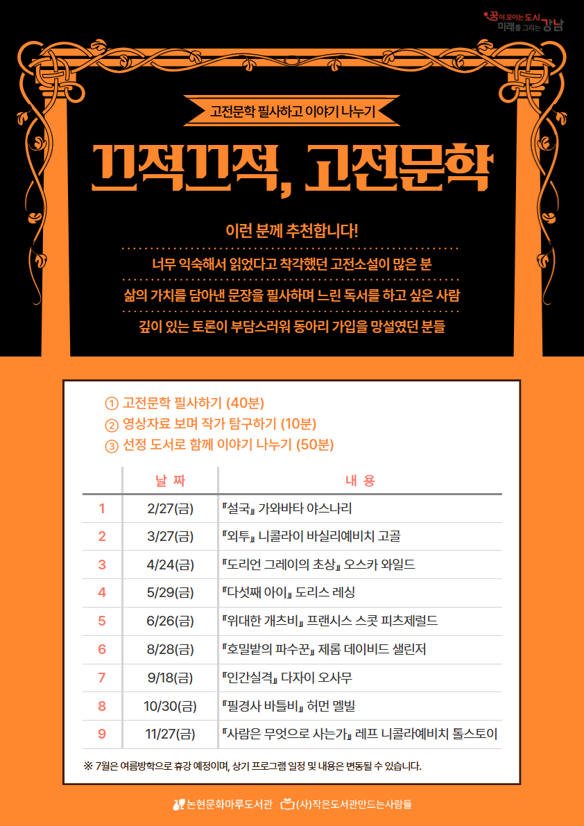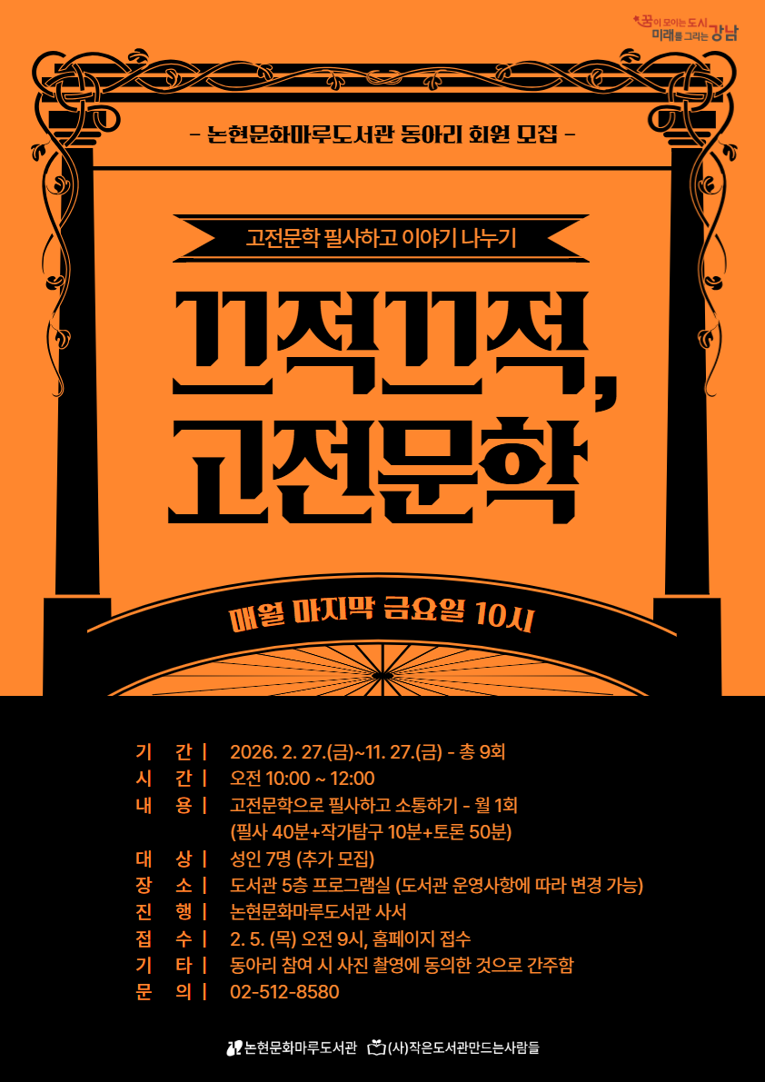 | 행사명 | 논현문화마루 [성인][동아리] 끄적끄적, 고전문학 (신규회원 추가 모집) |