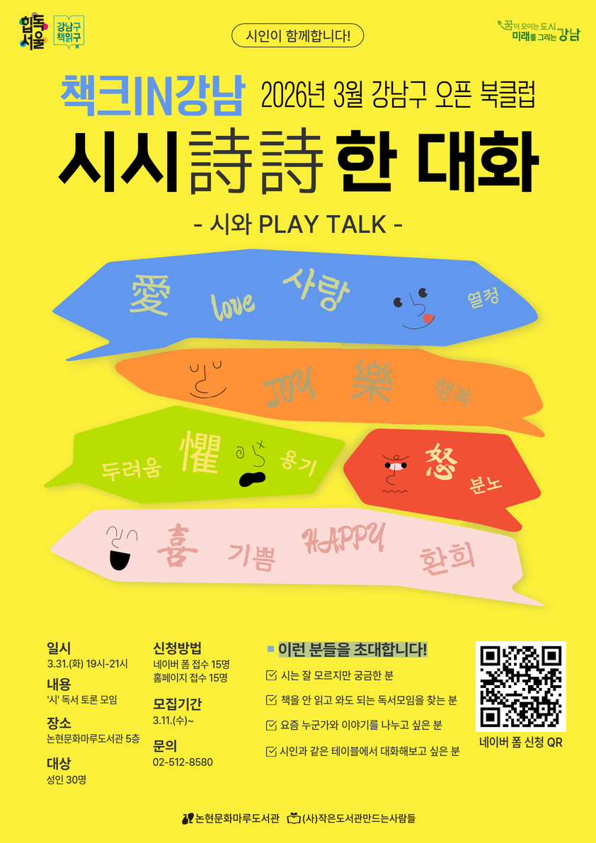 🌿3월 강남구 오픈 북클럽 책크in강남: 시시詩詩한 대화 📖 사전독서 없이 참여 가능한 시와 PLAY TALK 1. 일시: 2026. 3.31.(화) 19시~21시 2. 장소: 논현문화마루도서관 5층 3. 내용: '시'독서 토론 모임 4. 신청방법 - 홈페이지 접수 15명 - 네이버 폼 접수 15명 ( https://naver.me/FkauC9jF ) ※ 중복 접수 시 하나만 인정 5. 참가: 무료 6. 문의: 논현문화마루도서관 02-512-8580 📌 이런 분들을 초대합니다! ✓ 시는 잘 모르지만 궁금한 분 ✓ 책을 안 읽고 와도 되는 독서모임을 찾는 분 ✓ 요즘 누군가와 이야기를 나누고 싶은 분 ✓ 시인과 같은 테이블에서 대화해보고 싶은 분 ![]() ![]() |