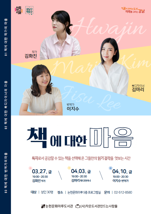 - 1강 책에 대한 작가의 마음 - 김화진(작가) - 2강 책에 대한 북디자이너의 마음 - 김마리(북디자이너) - 3강 책에 대한 번역가의 마음 - 이지수(번역가) ※ 회차별로 각각 신청 부탁드립니다! ![]() ![]() [회차별 내용] 1강(3/27, 금) : 김화진(작가) / 편집자에서 작가로 자리를 옮긴 경험을 바탕으로 책을 만드는 과정을 편집자와 작가 두 시선에서 이야기 나누는 시간 2강(4/3, 금) : 김마리(북디자이너) / 독자의 감각을 바탕으로 책을 디자인해온 북디자이너의 읽기에 대해 이야기하고, 지금까지 작업해 온 책들의 비하인드 스토리를 소개하는 시간 3강(4/10, 금) : 이지수(번역가) / 한 작가를 오래 좋아해 온 독자의 시간이 번역가의 길로 이어진 과정과 번역가의 작업 세계를 엿보는 시간 ![]() |