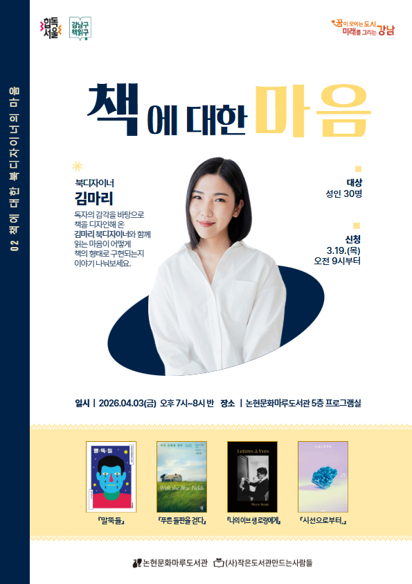 | 행사명 | 논현문화마루 [성인] 책에 대한 마음 - 2강 김마리 북디자이너 |