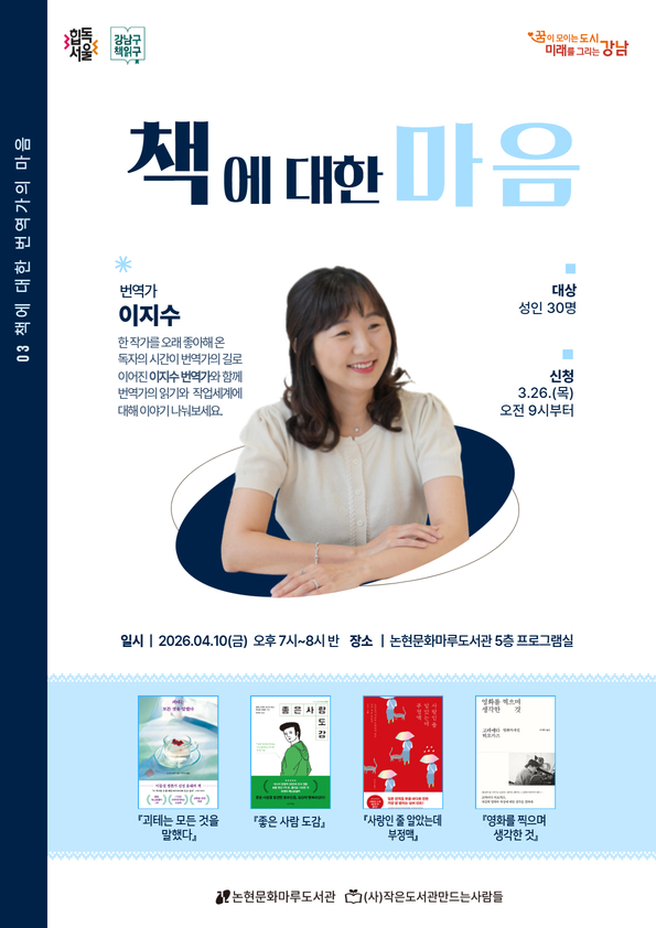 | 행사명 | 논현문화마루 [성인] 책에 대한 마음 - 3강 이지수 번역가 |