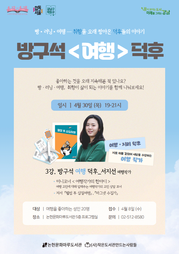 | 행사명 | 논현문화마루 [성인][도서관 주간] 방구석 < > 덕후_3강 여행 덕후 편 |