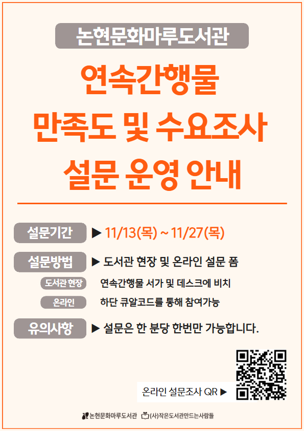 | 제목 | [논현문화마루도서관] 2025 연속간행물 만족도 및 수요조사 설문 운영 안내 |