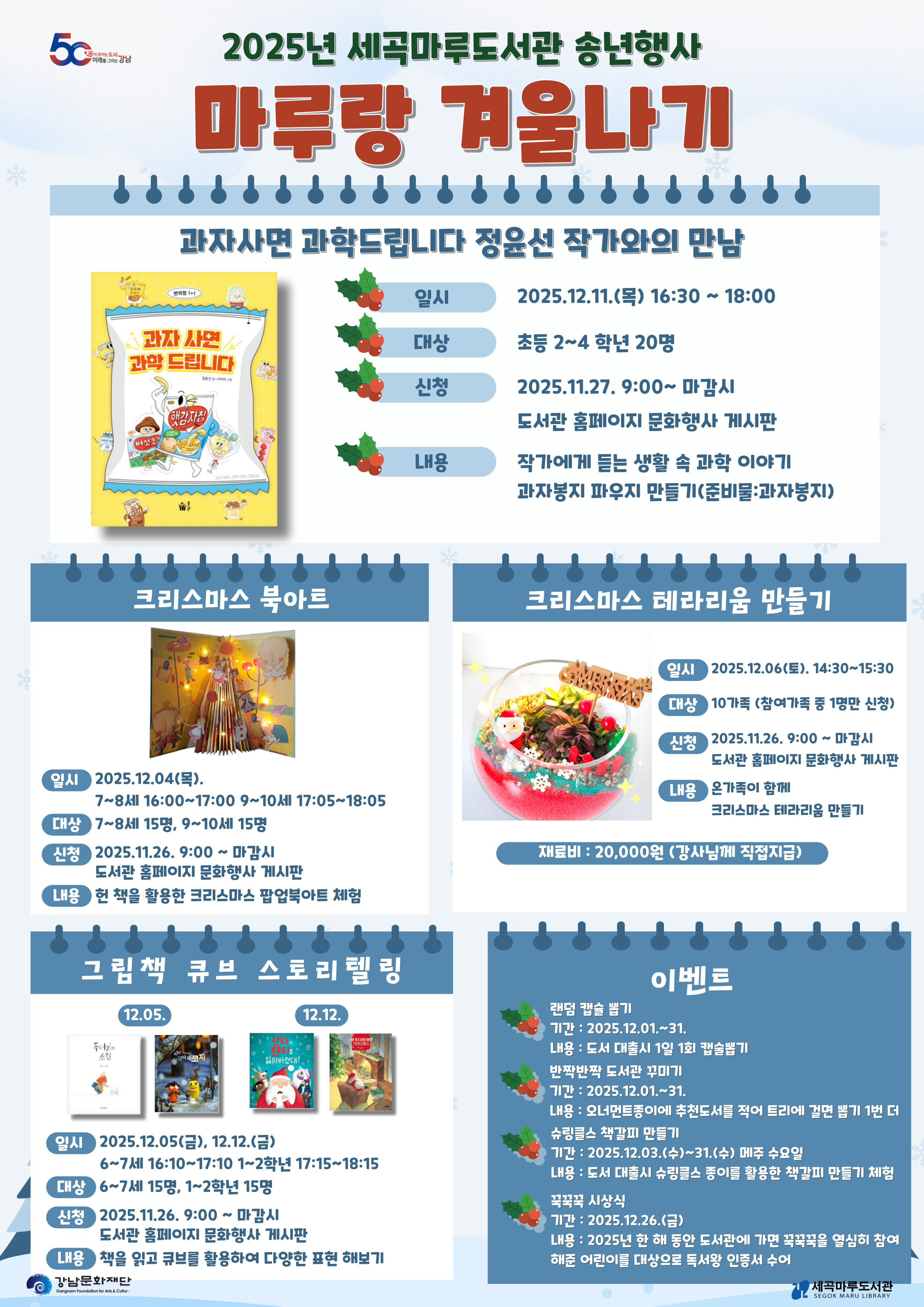 세곡마루도서관에서 2025년 한 해의 마무리를 책과 함께 할수 있는 행사, 이벤트를 준비하였습니다