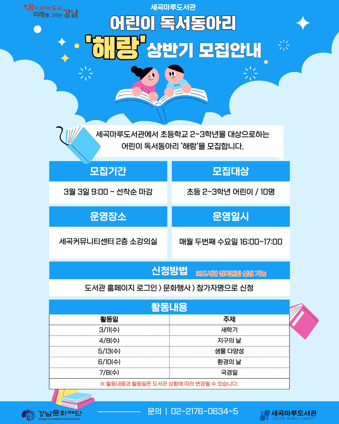 세곡마루도서관 어린이 독서동아리<해랑> 상반기 활동을 함께 할 친구들을 모집합니다!