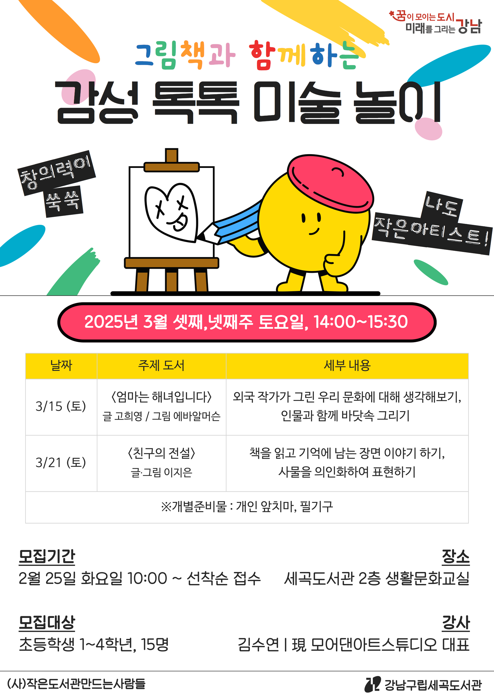 ※접수 시작은 2025년 2월 25일 (화) 오전 10시 ~ 선착순 접수 입니다. ■대면수업 세곡도서관 2층 생활문화교실 ■접수대상 초등학교 1~4학년, 15명 ■수업날짜 3.15 / 3.22 (셋째, 넷째 토요일 / 14시~15시30분) → 총 2회 진행 ■개별 준비물 : 개인 앞치마, 필기구 지참하여 참석 부탁드립니다. ■접수 방법(페이지 하단 "행사신청" 클릭) 세곡도서관 홈페이지>문화행사>신청자 본인 아이디로 접수 바랍니다. ★접수 시, 홈페이지 서버시간에 따라 1분~최대 3분 정도 차이가 날 수 있습니다. ![]()