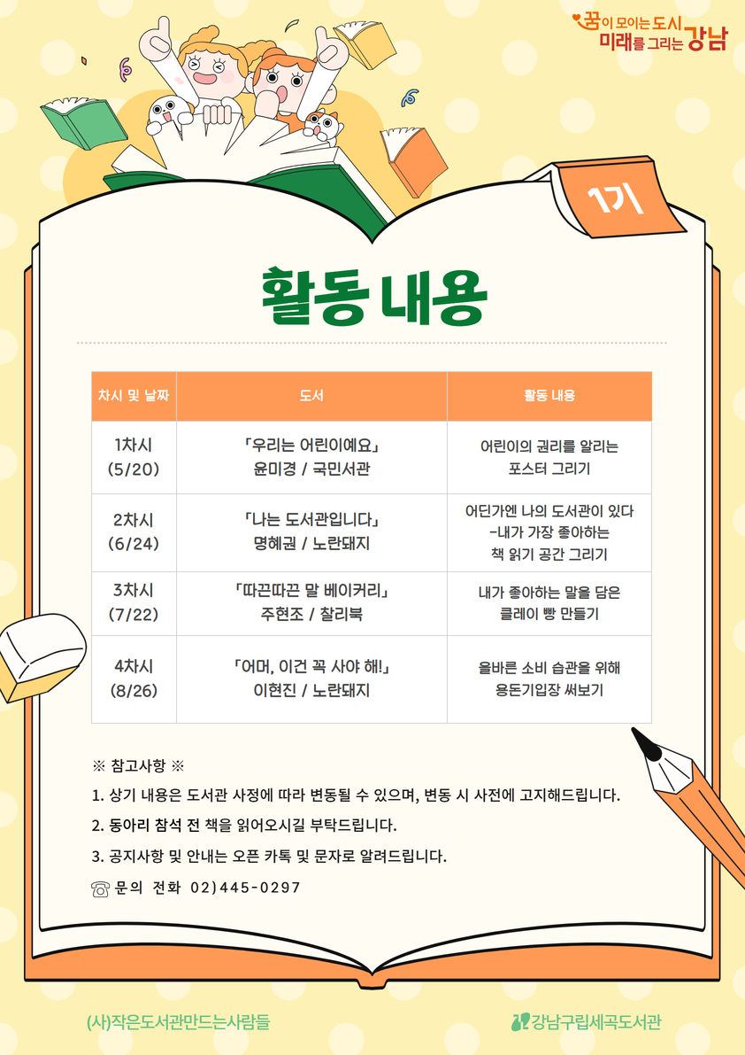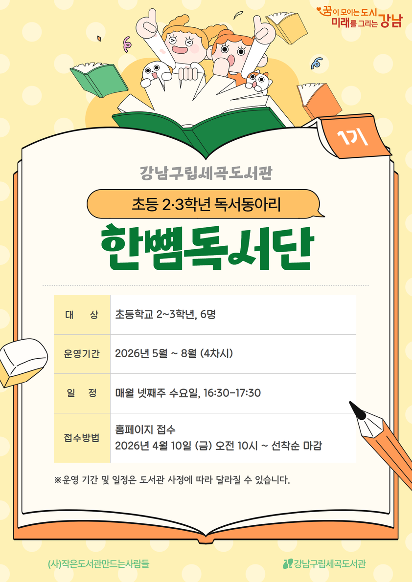 ※접수 시작은 2026년 4월 10일(금) 오전 10시 입니다. ■장소 세곡동복합문화센터 2층, 어린이교실 ■접수 대상 초등학교 2~3학년, 6명 ■일정 2026년 5월 20일 (수) ~ 8월 26일 (수), 총 4차시 매월 넷째 주 수요일 16:30~17:30 *세부 일정은 첨부된 이미지를 참고해 주세요. ■주의사항 -불참 시, 사전에 도서관으로 연락 부탁드립니다. ■접수 방법(페이지 하단 "행사신청" 클릭) 세곡도서관 홈페이지>문화헹사>신청자 본인 아이디로 접수 바랍니다. ★접수 시, 홈페이지 서버 시간에 따라 1분~ 최대 3분 정도 차이가 있을 수 있습니다. ![]() ![]()