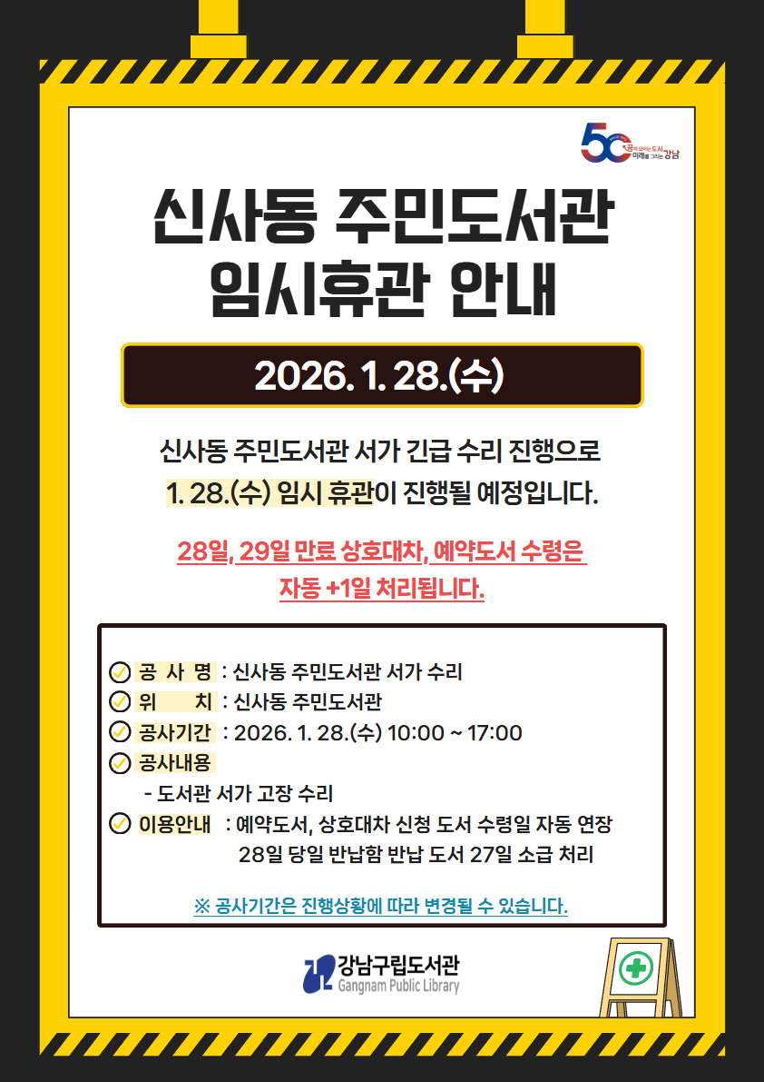 [주민도서관] 신사동 주민도서관 임시 휴관 안내 (2026.1.28.)