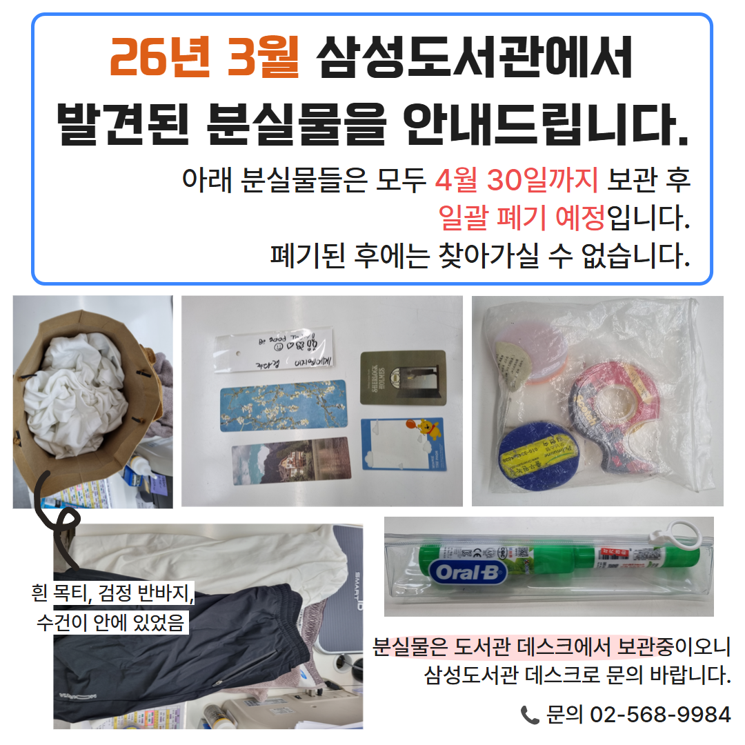 [삼성도서관] 2026년 3월 분실물 안내(4월 30일 폐기 예정)