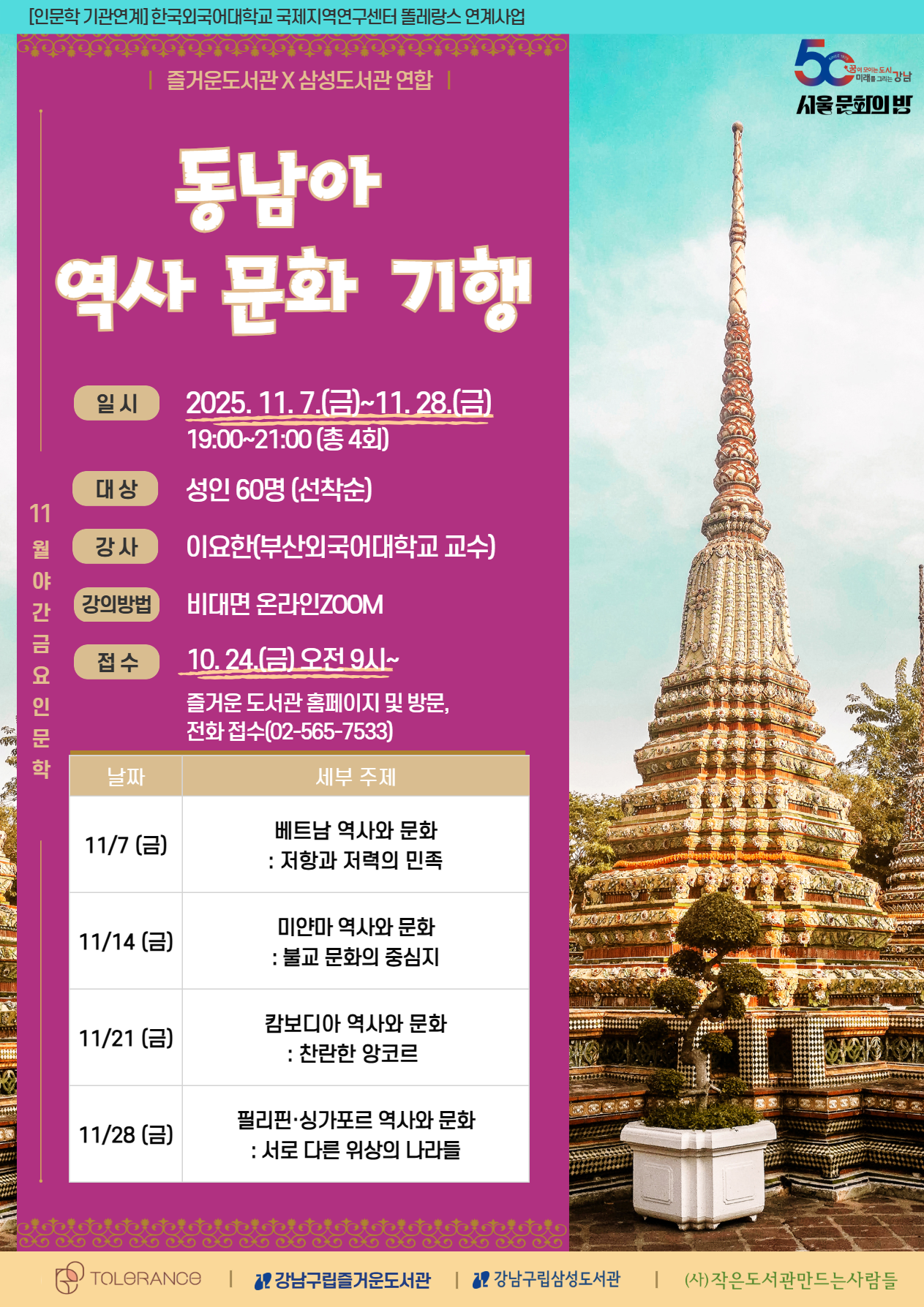 | 행사명 | 삼성 [연합][비대면][11월야간금요인문학] '동남아 역사 문화 기행' |