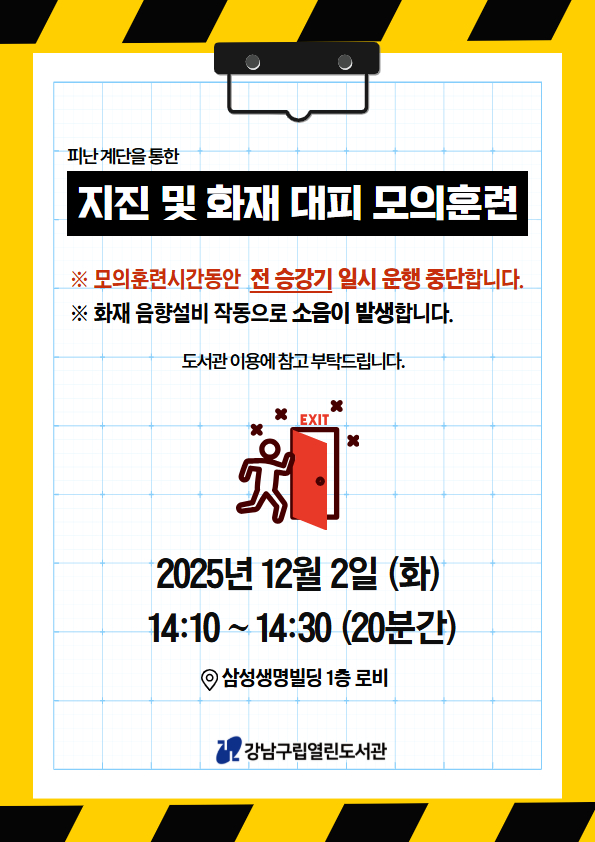 안녕하세요, 강남구립 열린도서관입니다. 2025년 12월 2일 (화) 14:10~14:30에 일원역 삼성생명빌딩 로비 1층에서 피난 계단을 통한 「지진 및 화재 대피 모의훈련」을 실시할 예정입니다. 모의훈련시간동안 전 승강기가 일시적으로 운행 중단되며, 화재 음향설비 작동으로 소음이 발생하오니 도서관 이용 시 참고 부탁드립니다. 문의: 열린도서관(02-3412-3970)