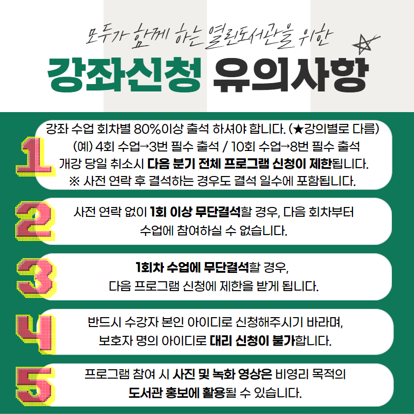 작년 여름 나만의 '여름 안전송'을 작사작곡해봤다면, 이번에는 5월 가정의 달을 맞아 '우리 가족 노래'를 만들어 봅시다. 작사작곡의 기초를 배워보며 우리 가족을 노래로 소개해 보는 즐거운 시간🎵 많이 많이 신청해주세요~😁 대상을 작년과 같이 1 ~ 3학년으로 확대하여 재모집합니다😊 ![]() ![]() ※ 참여하는 어린이 본인의 아이디로 신청해주세요. ※ 프로그램 관련 공지사항은 문자로 발송되오니, 회원가입 시 입력된 휴대폰번호 확인 부탁드립니다. ○ 일시 : 2025년 5월 3일 ~ 5월 24일 (매주 토) 10:00 ~ 11:30 |