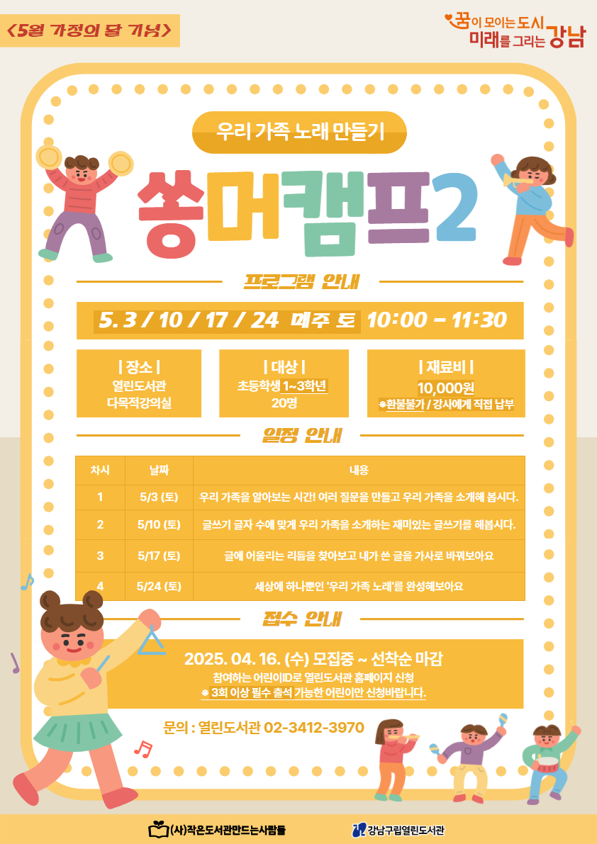 | 행사명 | 열린 [대면][가정의달](재공지) 어린이 쏭머캠프2 - 우리 가족 노래 만들기 |