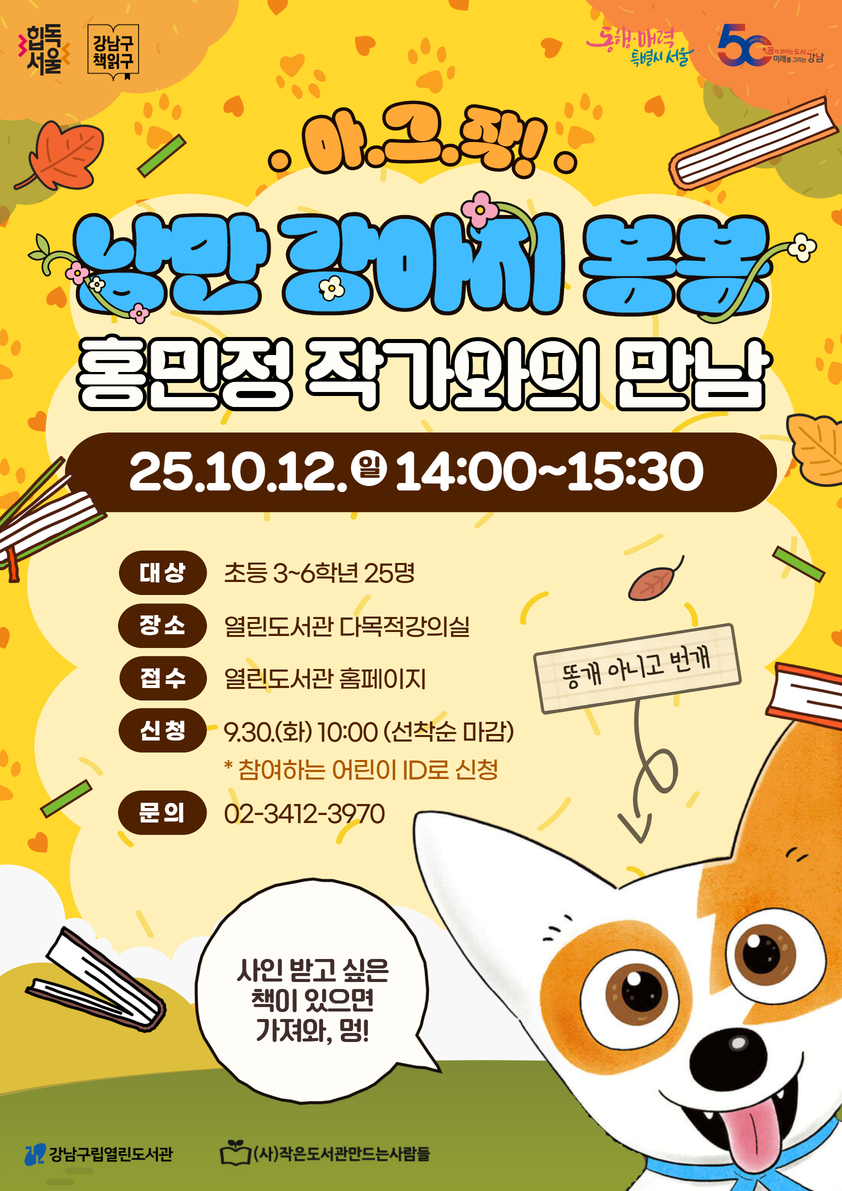 열린도서관 아동문학 & 그림책 작가와의 만남〈아.그.작〉! 10월에는 어린이들에게 인기 만점!「낭만 강아지 봉봉」시리즈를 쓰신 홍민정 작가님을 모셨습니다. 마당을 박차고 나온 봉봉, 볼트와 너트, 그리고 시궁쥐 톱니까지! 봉벤져스와 함께할 친구들은 도서관으로 모여라~! ★ 원활한 진행을 위해 1권을 꼭 읽고 참여해주세요! ![]() ![]() |