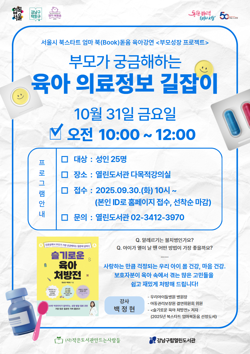 <부모가 궁금해하는 육아 의료정보 길잡이> 사랑하는 만큼 걱정되는 우리 아이 몸 건강, 마음 건강. 보호자분이 육아 속에서 겪는 많은 고민들을 쉽고 재밌게 처방해 드립니다 ! 🤔1년 내내 콧물나서 약을 끊지 못 하는 아이, 감기인가요 비염인가요? 🤔편식과 알레르기를 예방할 수 있는 이유식이 따로 있을까요? 🤔아이가 갑자기 열이 날 때, 어떻게 하는게 가장 좋을까요? 평소 아이를 키우면서 느끼셨을 건강 관리의 어려움, 우리아이들병원의 백정현 병원장님과 함께 해결해보는 시간을 가집니다! ![]() ![]() ※ 프로그램 신청 시 홍보용 사진 촬영 및 사용에 동의하시는 것으로 간주됩니다. ※ 프로그램 관련 공지사항은 문자로 발송되오니 회원가입 시 입력된 휴대폰 번호 확인 부탁드립니다. |