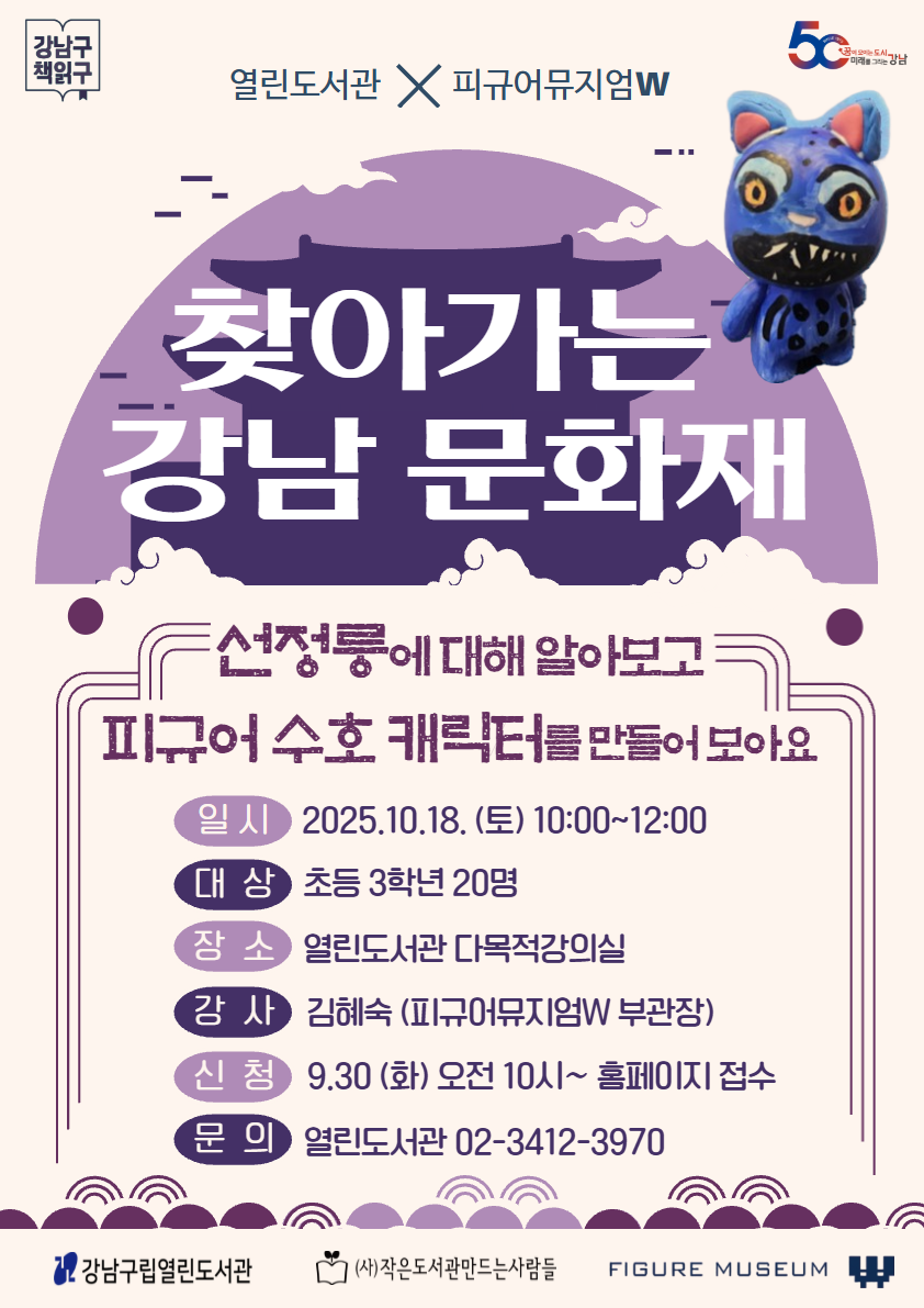 열린도서관에서 피규어뮤지엄w와 함께 연계하여 <찾아가는 강남 문화재> 프로그램을 진행합니다. <찾아가는 강남 문화재>에서는 우리 지역 문화유산인 선정릉에 대해 알아보고, 나만의 수호 캐릭터 피규어를 만듭니다. ↓↓↓ 함께하고 싶은 친구들은 아래 신청 버튼을 꾹 눌러주세요! ↓↓↓ ![]() ※ 본 프로그램은 피규어뮤지엄w와 함께하는 기관연계 프로그램입니다. ○ 일시 : 2025년 10월 18일 토요일 오전 10:00 ~ 12:00 (1회) |