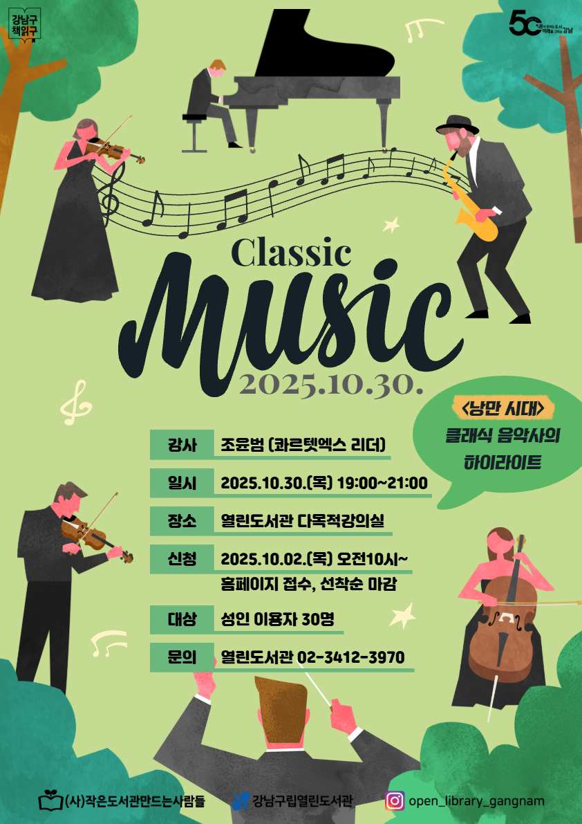 🎼<클래식 음악사의 하이라이트 : 낭만 시대>🎼 📍일시 : 2025년 10월 30일 목요일 19:00~21:00 📍대상 : 성인 30명 📍장소 : 열린도서관 다목적강의실 📍문의 : 강남구립열린도서관(02-3412-3970) 📍신청 : 🖥️ 홈페이지 접수-> 열린도서관(02-3412-3970) ![]() |