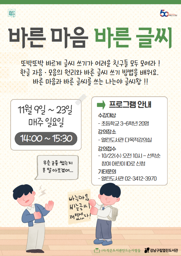 친구에게 주려고 정성들여 쓴 편지📜🖋 선생님께 제출한 수행평가📚 열심히 공부한 문제집에 적은 답들📖🖊 다들 내 글씨를 못 알아봐서 속상한 적 있나요? 예쁘고 바르게 글씨 쓰는 게 어려우신가요😥? 열린도서관에서 한글의 기본 원리와 자음·모음의 배열을 알아보고 올바른 글씨 쓰기로 악필 탈출해요! ![]() ![]() |