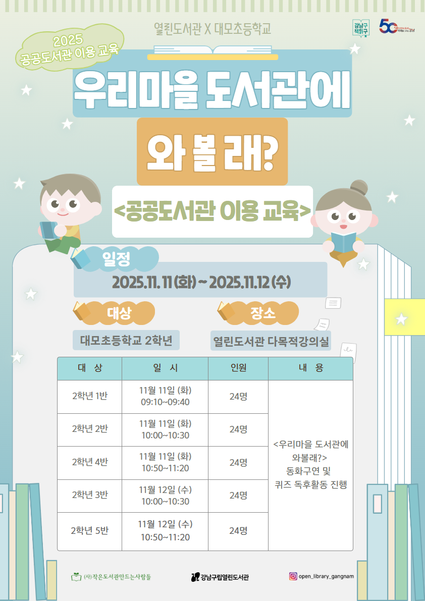 | 행사명 | 열린 [대면][기관연계]『열린도서관×대모초등학교』우리마을 도서관에 와볼래? |