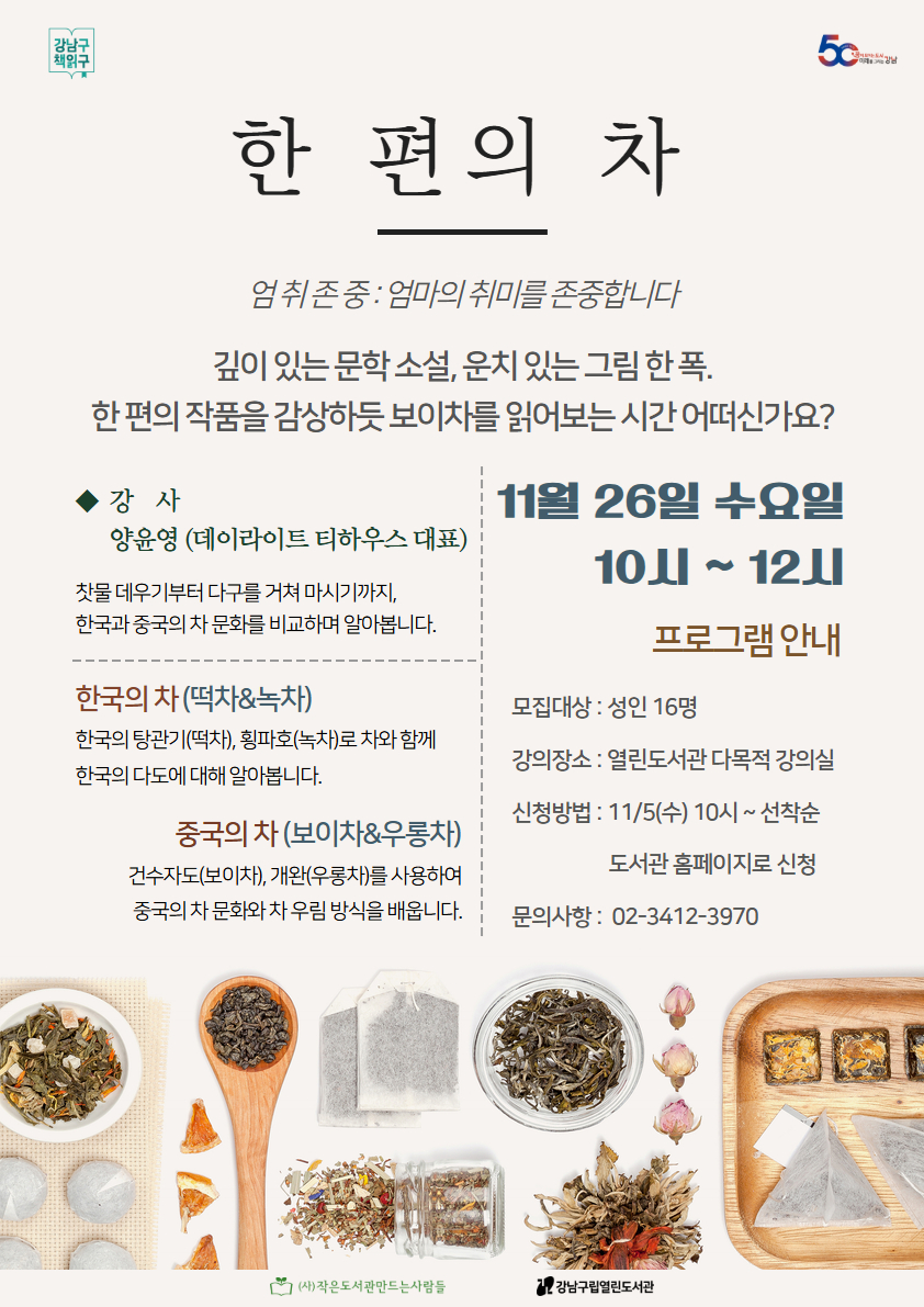 깊은 여운의 문학 소설 한 장, 운치있는 그림 한 폭처럼 한 편(篇)의 작품을 감상하듯 마음에 스며오는 차 한 편(片) 어떠세요? ![]() ![]() ※ 프로그램 관련 공지사항은 문자로 발송되오니 회원가입 시 입력된 휴대폰번호 확인 부탁드립니다.