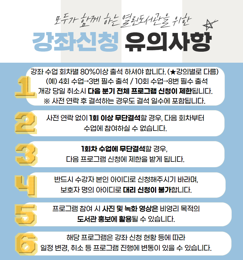 2026년 새해 & 새학기를 맞아 정리왕으로 다시 태어나고 싶은 친구들은 주목! 정리수납전문가 선생님과 함께 재미있는 그림책도 읽고, 똑똑한 물건 정리정돈 방법도 알아봐요! ★ 2026년 기준 예비 초등 1~2학년(2018~2019년생) 대상 프로그램입니다. ★ 2회 모두 참여 가능한 경우에만 신청해주세요! ![]() ![]() |