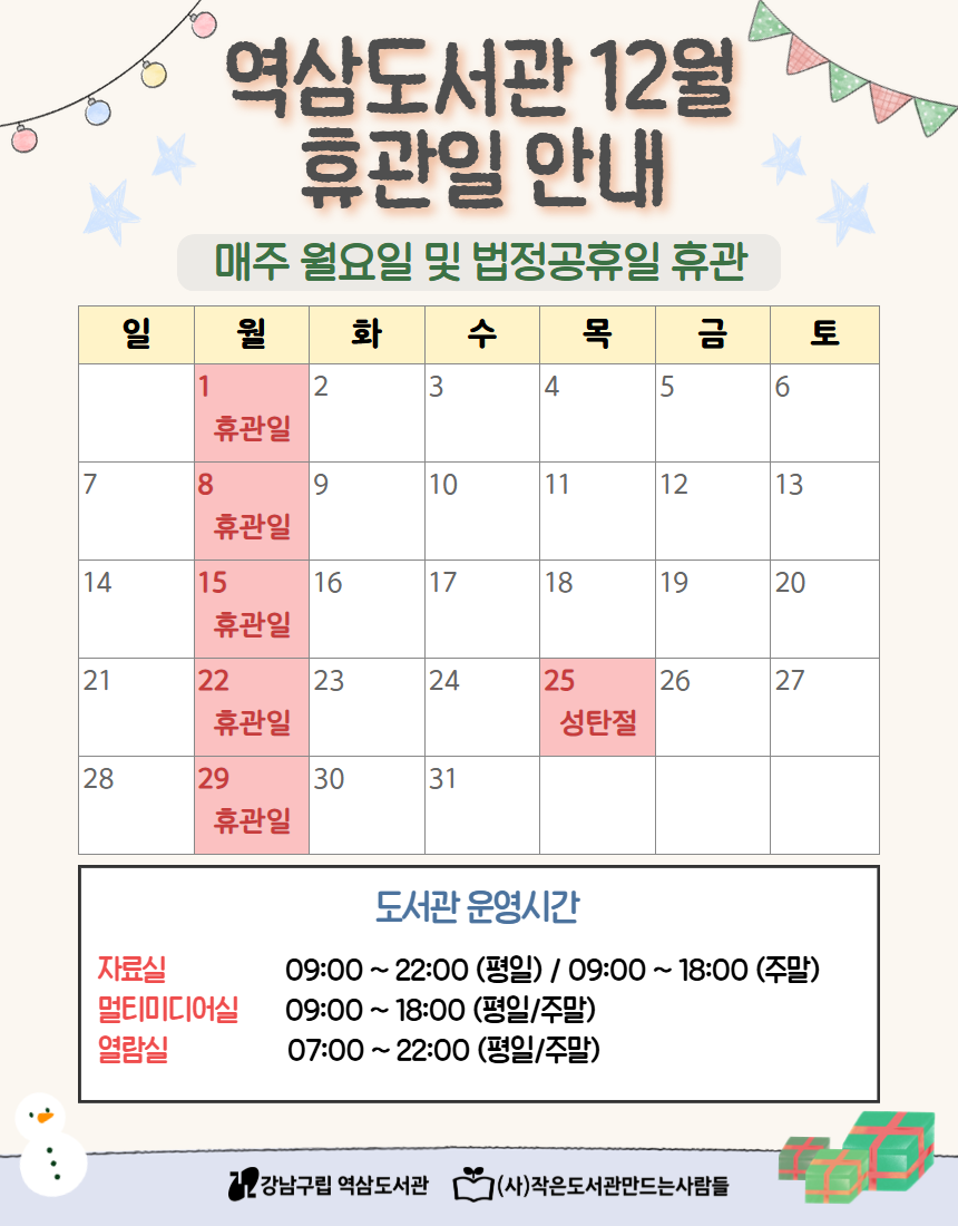 | 제목 | 역삼도서관 12월 휴관일 안내 |