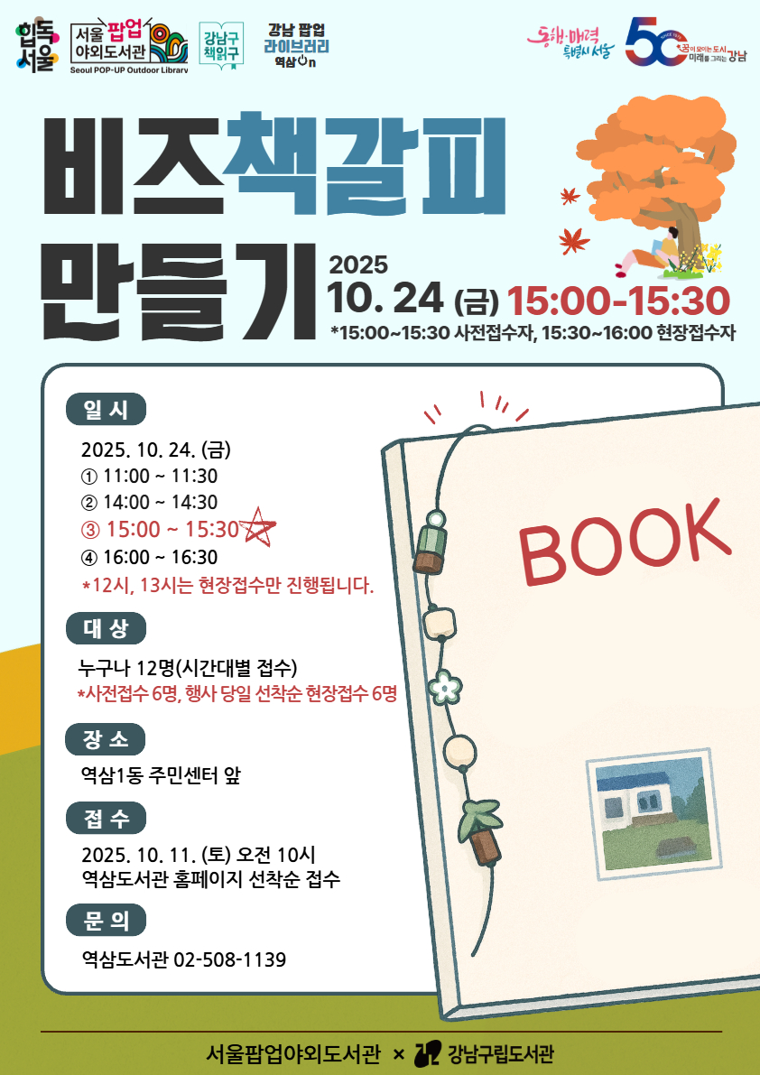 행사명 역삼 [강남팝업라이브러리 : 역삼On 야외도서관] 비즈책갈피 만들기 (15:00~15:30)