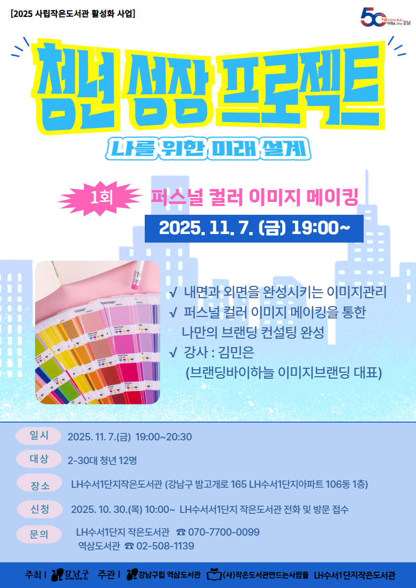 | 행사명 | 역삼 [성인-대면][2025 사립작은도서관 활성화 사업] 청년 성장 프로젝트#1. 퍼스널 컬러 이미지 메이킹 |